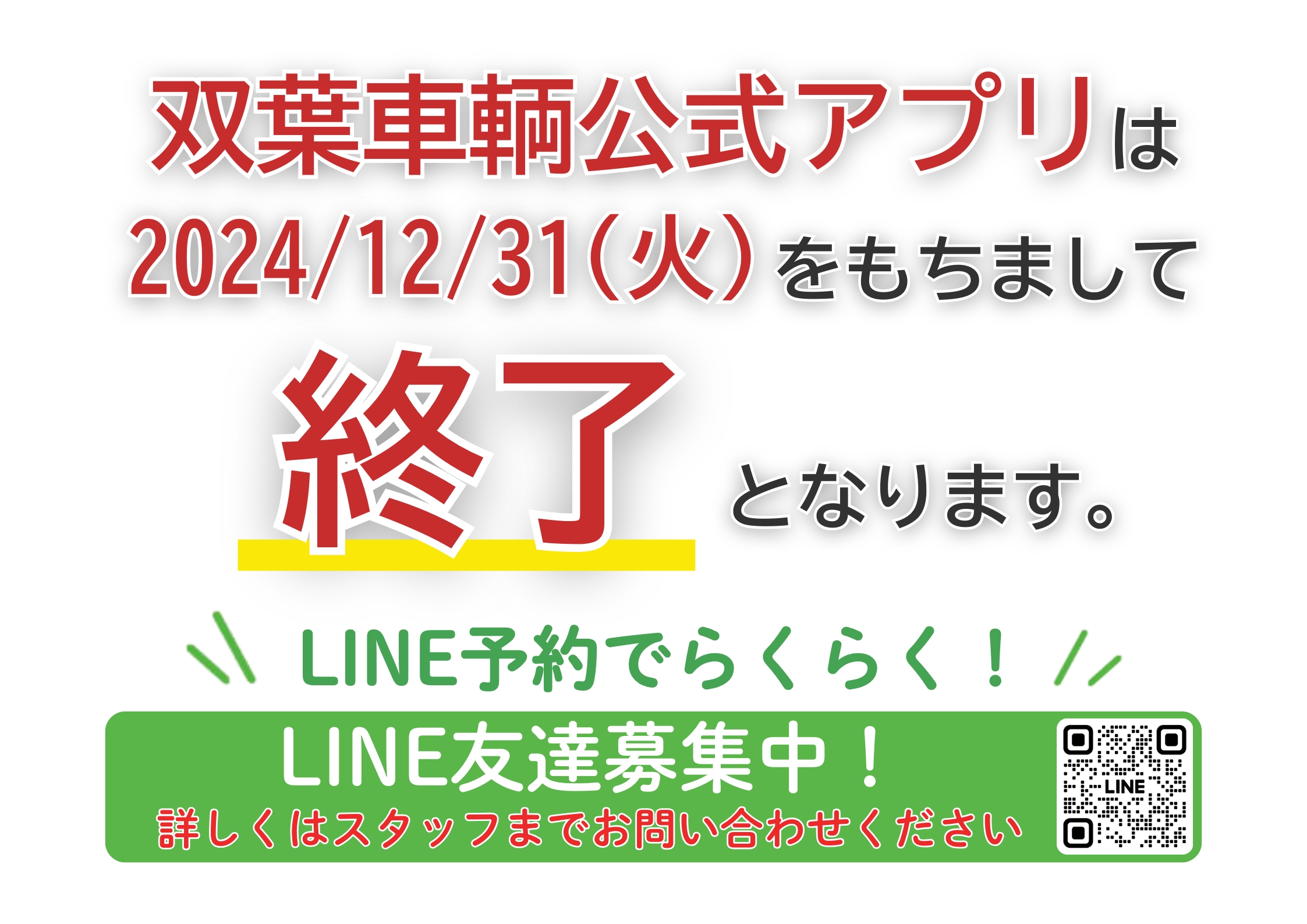 【重要なお知らせ】 双葉車輛公式予約アプリ 運用終了のご案内