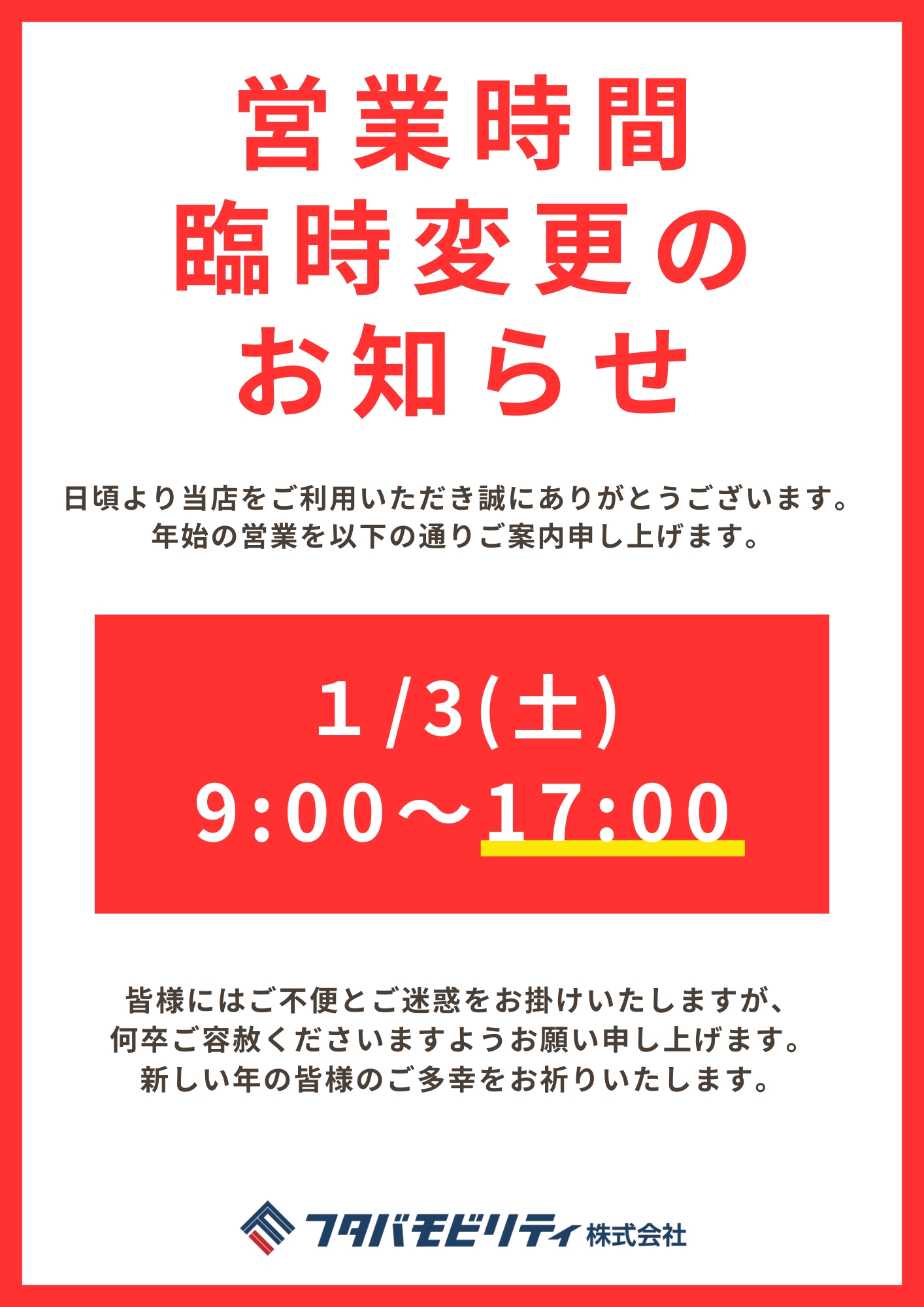 年始の営業につきまして、下記のとおり営業時間を一部変更させていただきます。