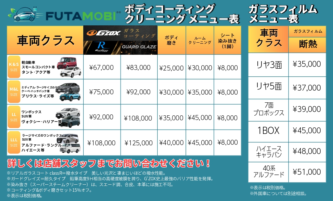 車種やお車の状態により、施工内容・価格が変わる場合がございますので、