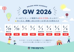 ただし、 🔧サービス(整備)は 5/3(土)~5/6(火) の期間お休みとなります。 ※点検・整備のご対応はできませんのでご了承ください。