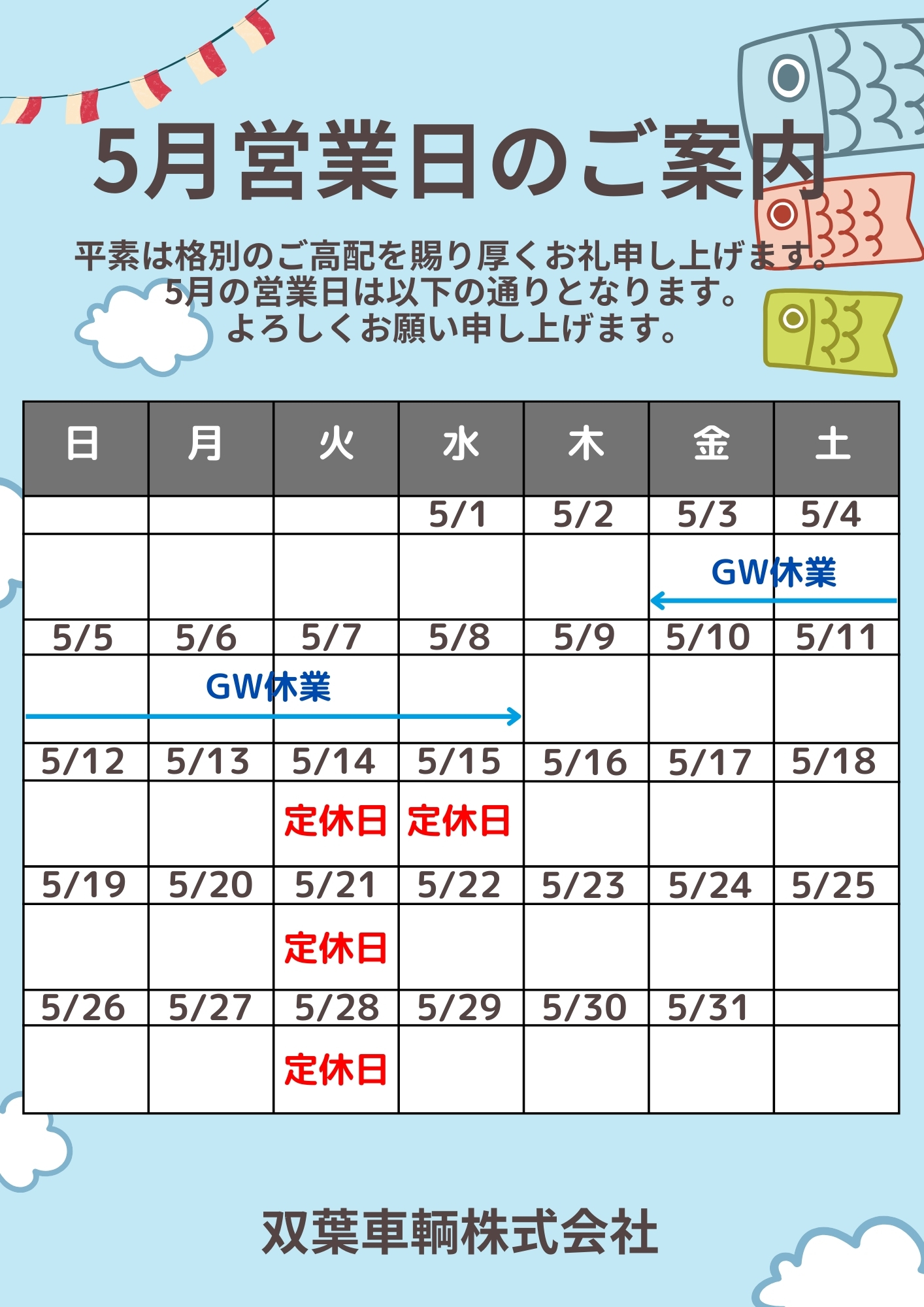5/9(木)からは通常営業としますので、何かありましたら双葉車輌までお問い合わせくださいね