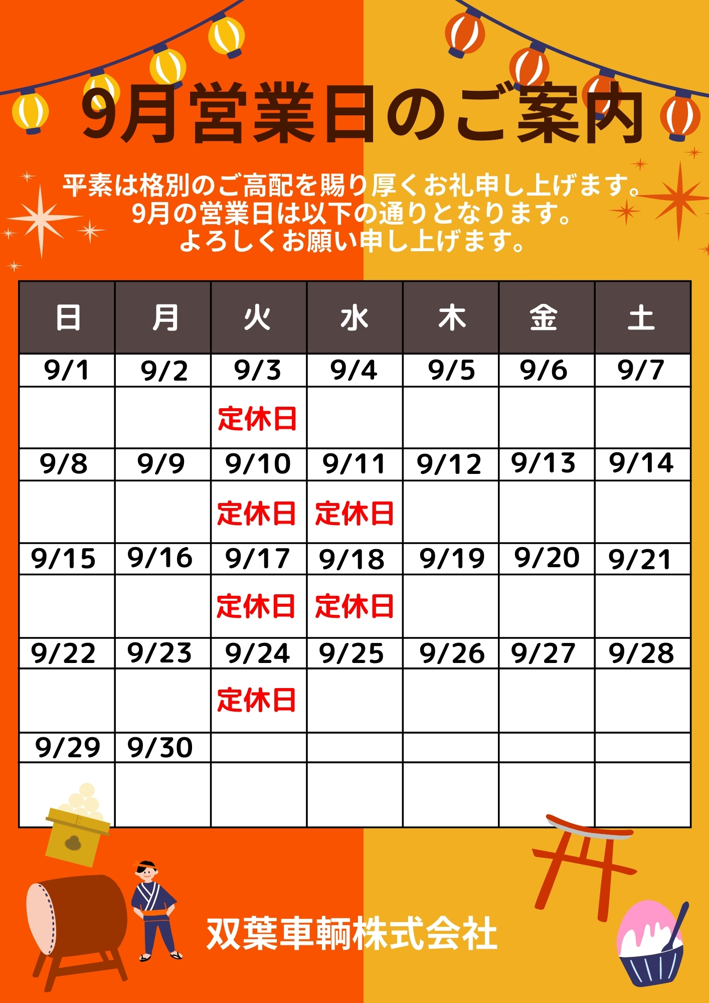 【9月営業日のお知らせ】