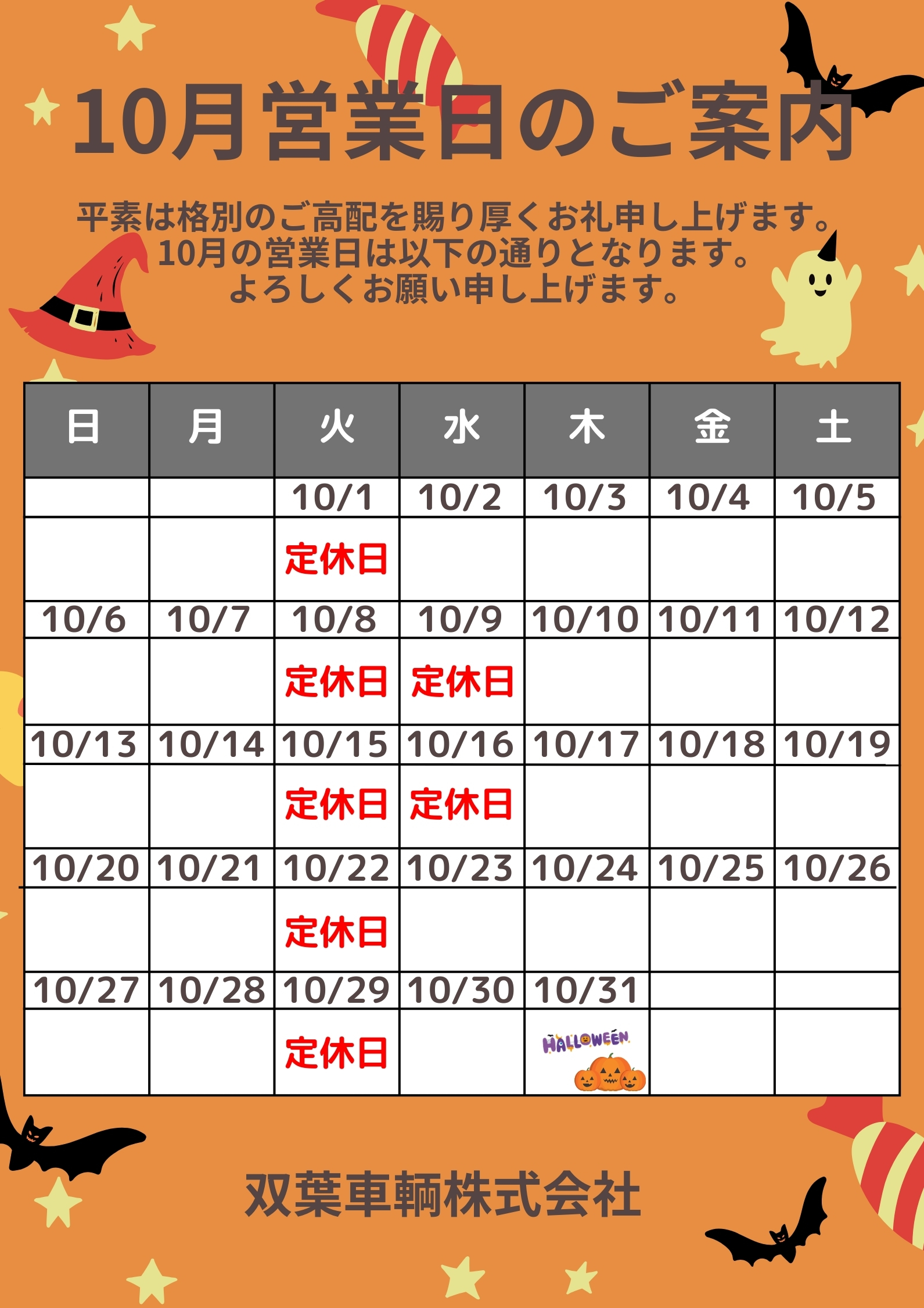 10月営業日のご案内🍂