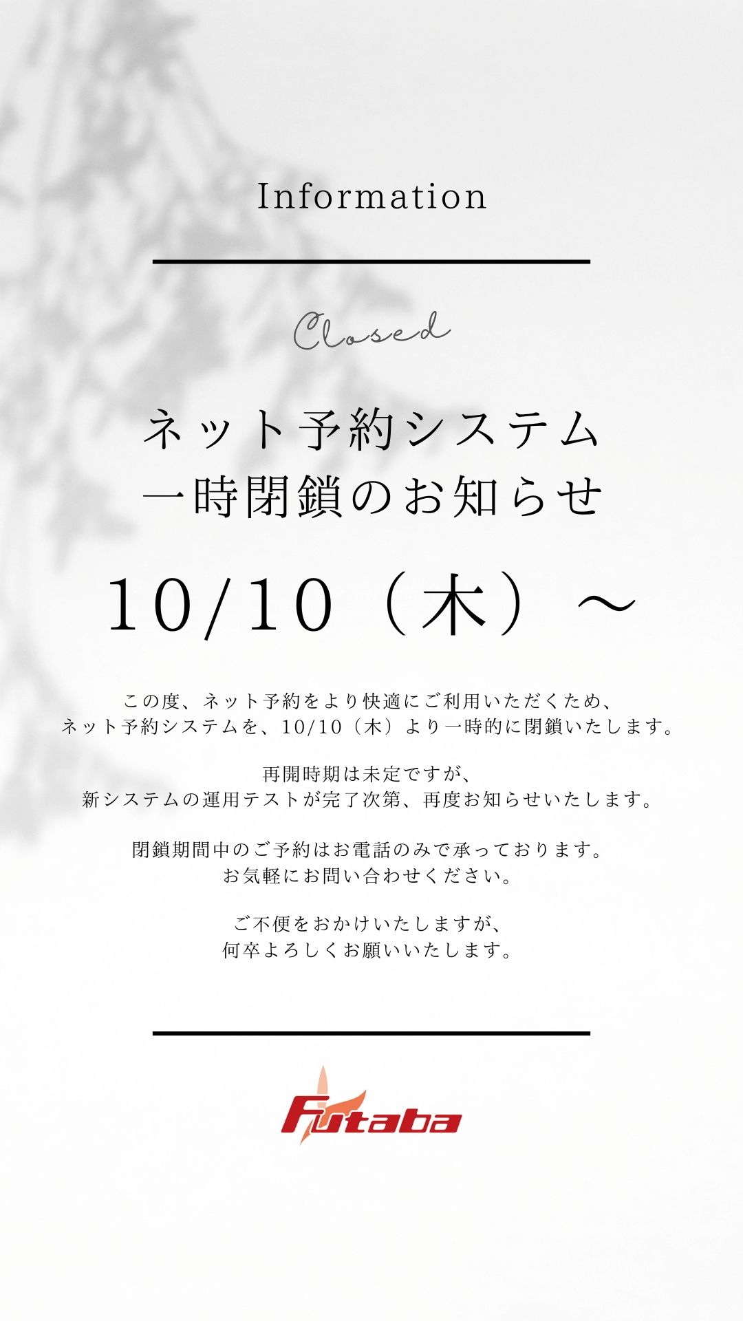 この度、ネット予約をより快適にご利用いただくため、ネット予約システムを、 10月10日(木)より一時閉鎖させていただくこととなりました。