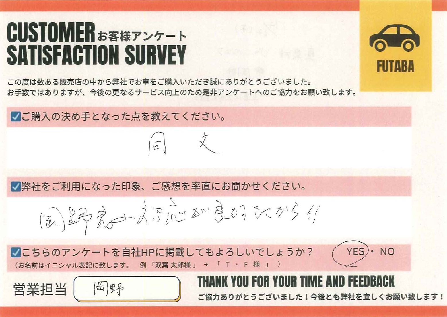 今後のカーライフも、担当の岡野をはじめ、双葉車輌スタッフ一同全力でサポートさせていただきます![]()