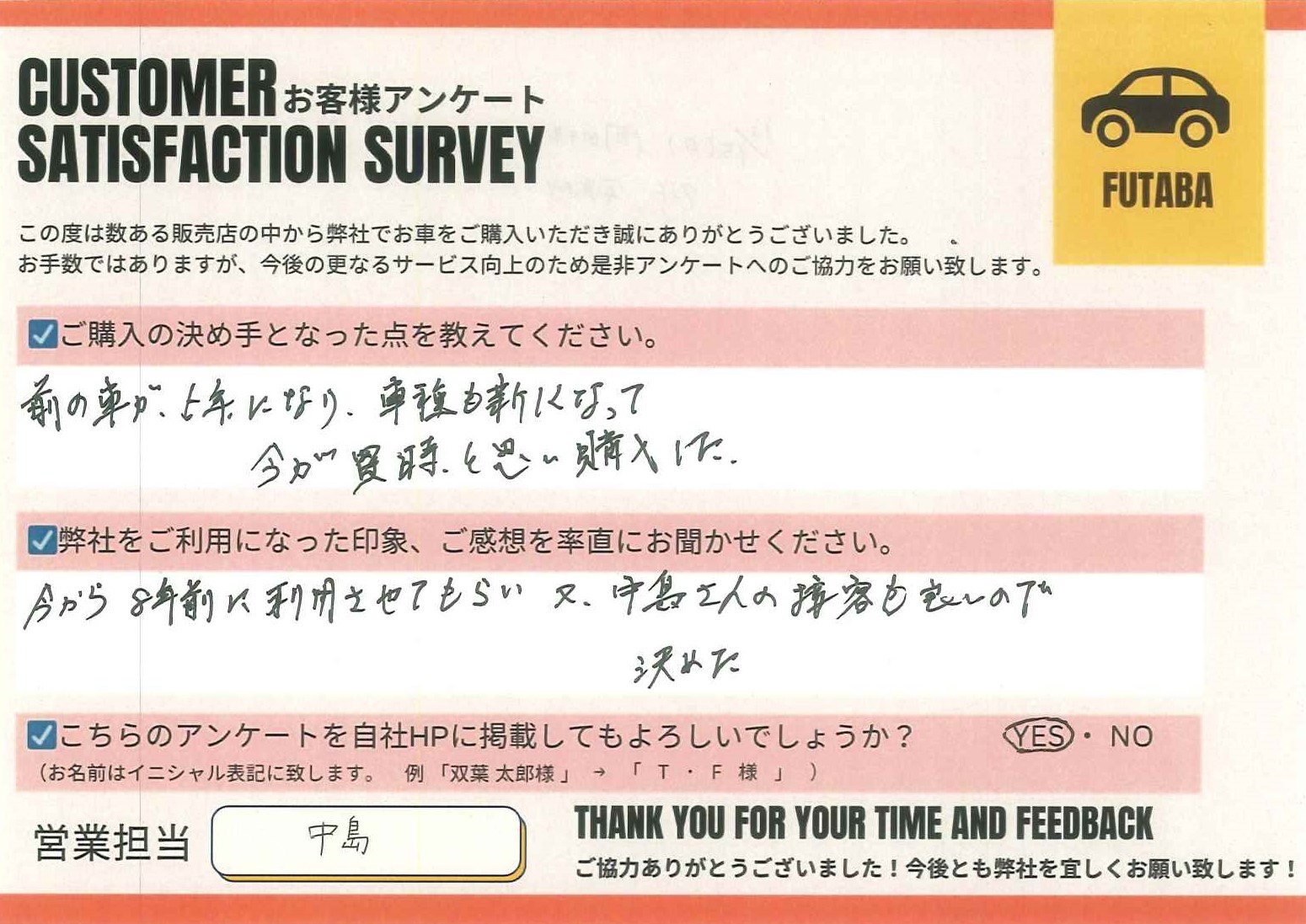 今後のカーライフも、担当の中島をはじめ、双葉車輌スタッフ一同全力でサポートさせていただきます![]()