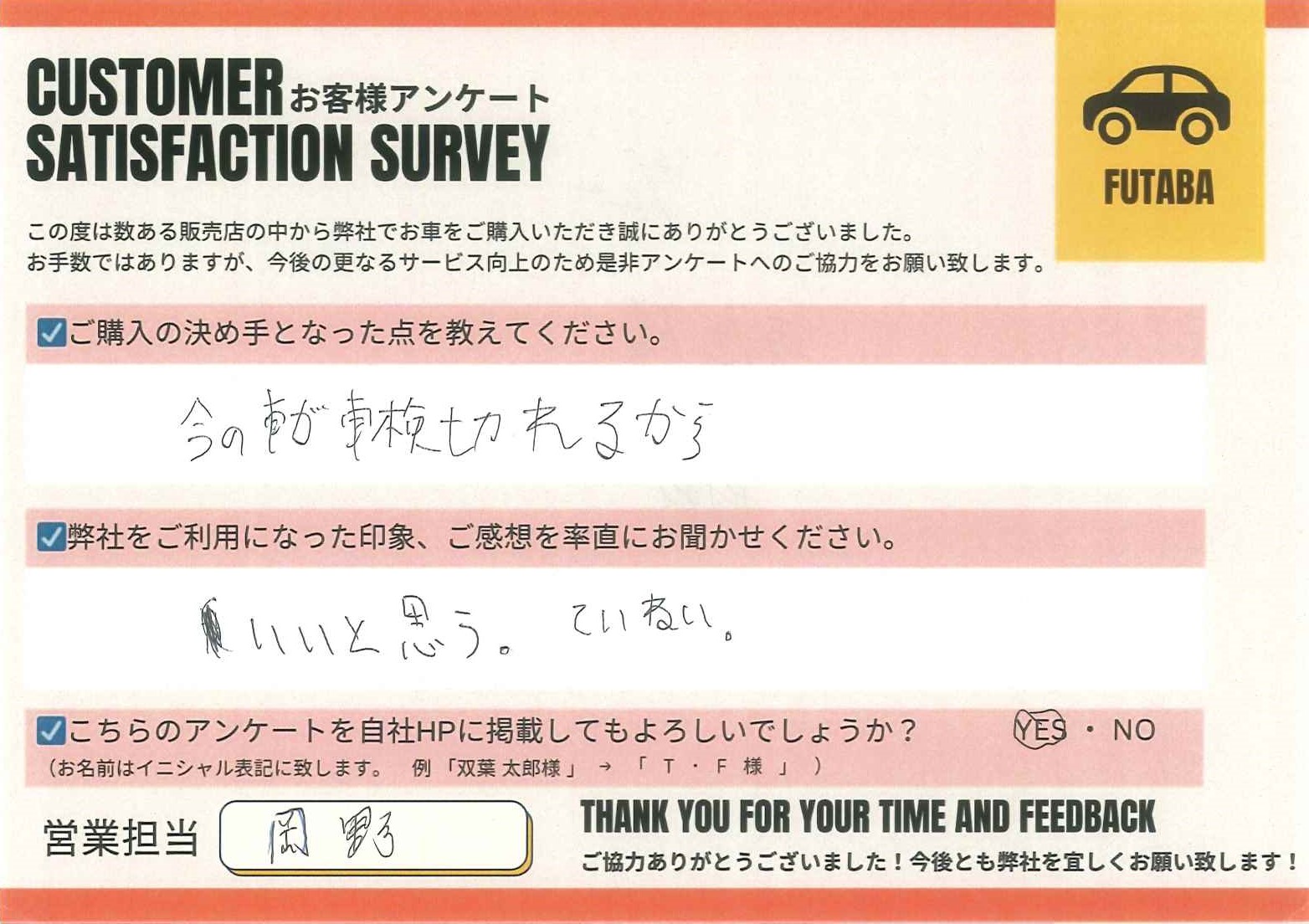 今後のカーライフも、担当の岡野をはじめ、双葉車輌スタッフ一同全力でサポートさせていただきます![]()