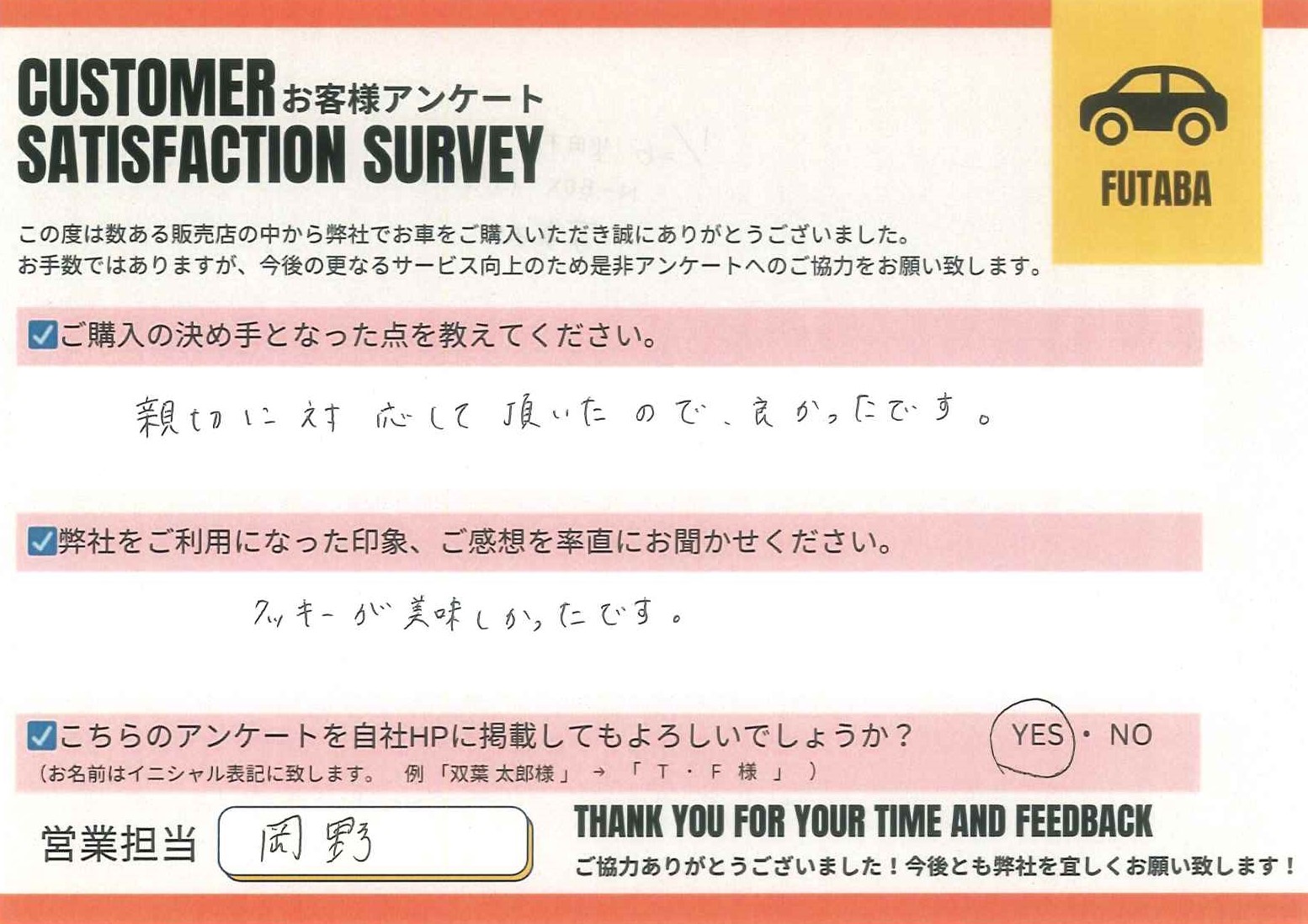今後のカーライフも、担当の岡野をはじめ、双葉車輌スタッフ一同全力でサポートさせていただきます![]()