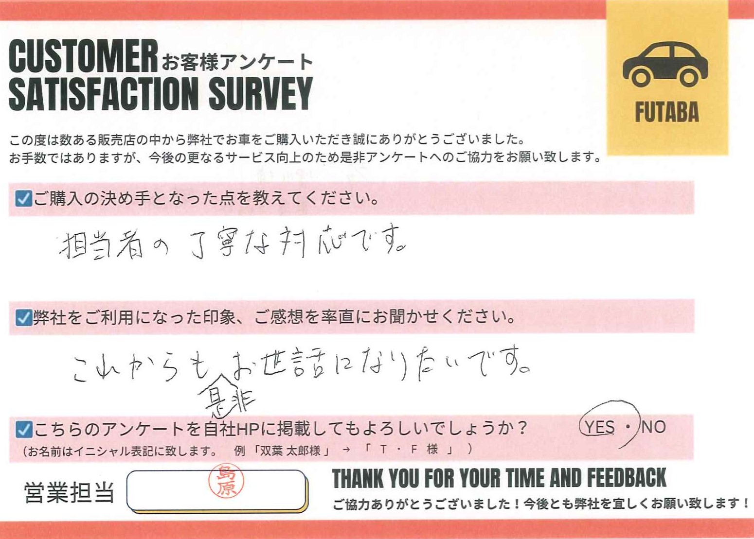 今後のカーライフも、担当の島原をはじめ、双葉車輌スタッフ一同全力でサポートさせていただきます![]()