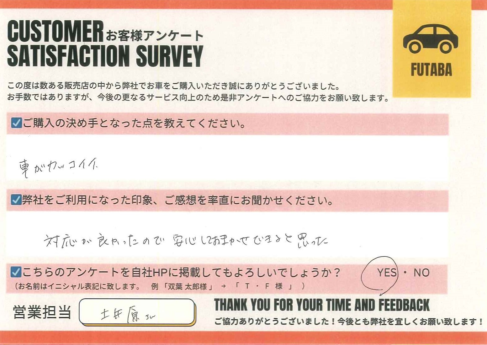 今後のカーライフも、担当の土井原をはじめ、双葉車輌スタッフ一同全力でサポートさせていただきます