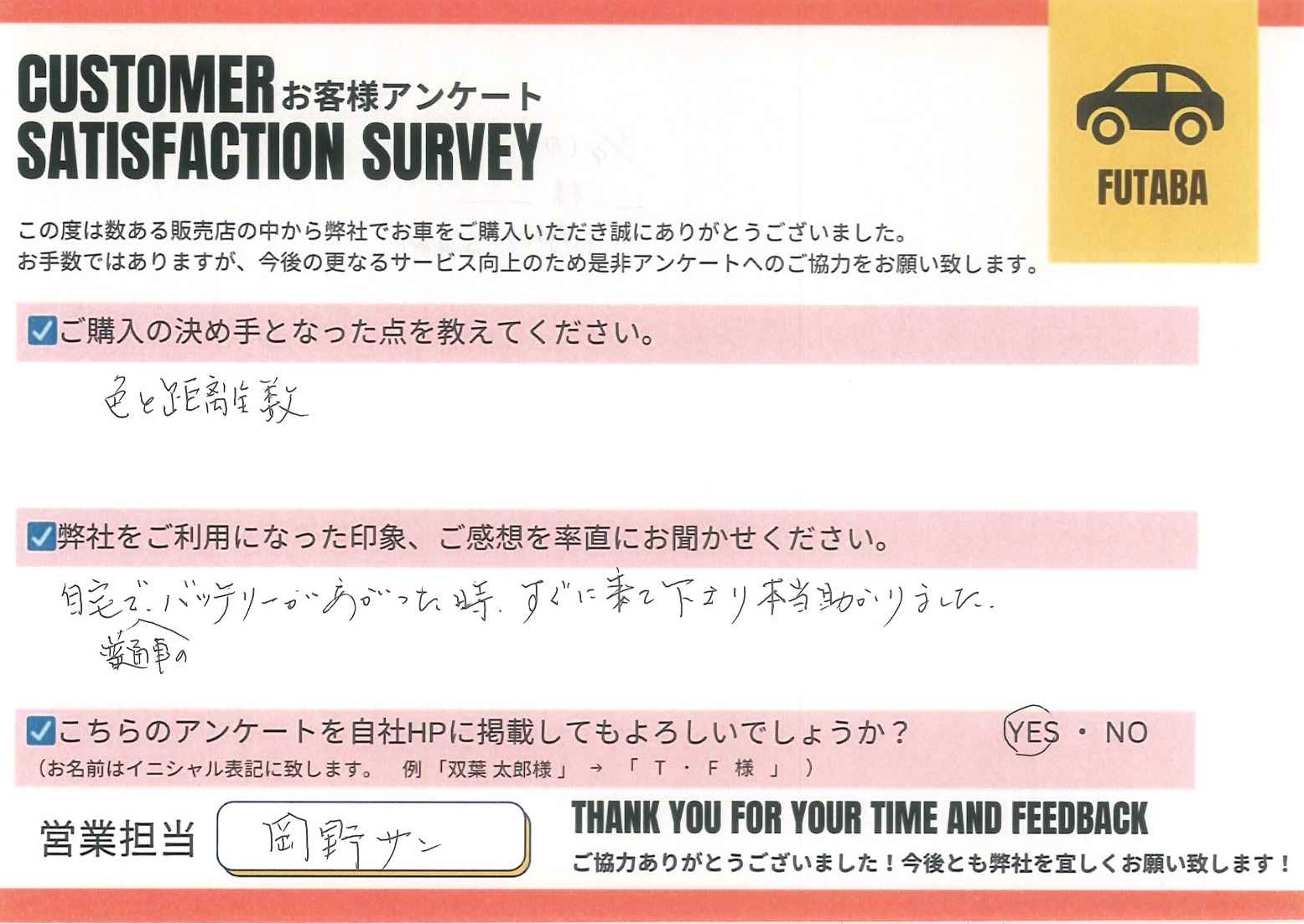 今後のカーライフも、担当の岡野をはじめ、双葉車輌スタッフ一同全力でサポートさせていただきます![]()