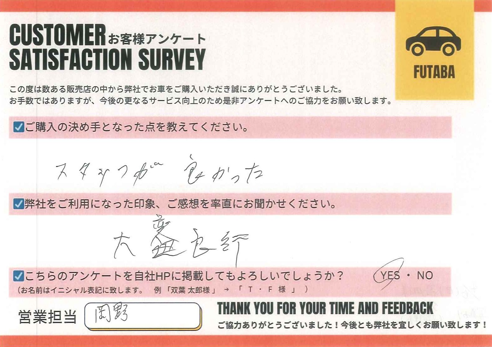 今後のカーライフも、担当の岡野をはじめ、双葉車輌スタッフ一同全力でサポートさせていただきます