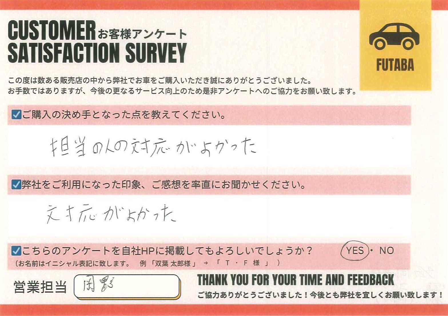 今後のカーライフも、担当の岡野をはじめ、双葉車輌スタッフ一同全力でサポートさせていただきます