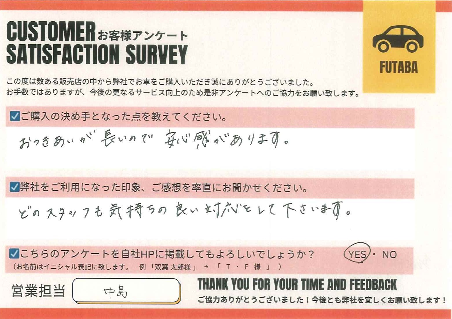 今後のカーライフも、担当の中島をはじめ、双葉車輌スタッフ一同全力でサポートさせていただきます![]()