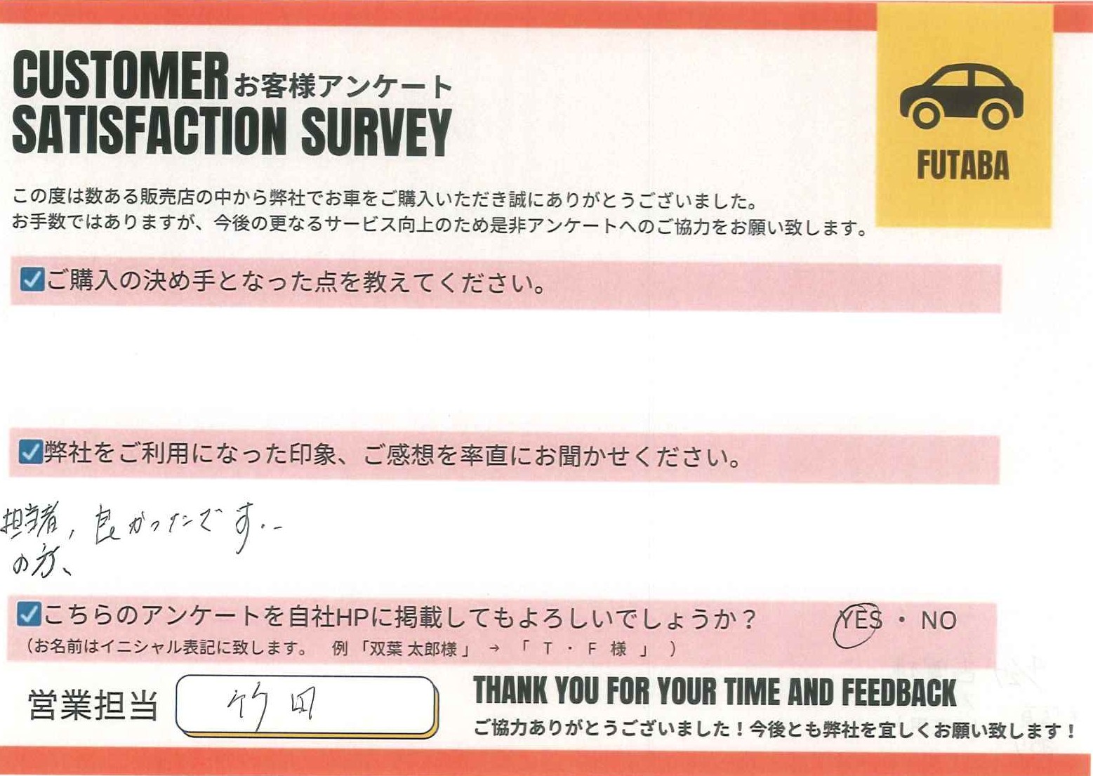 今後のカーライフも、担当の竹田をはじめ、双葉車輌スタッフ一同全力でサポートさせていただきます