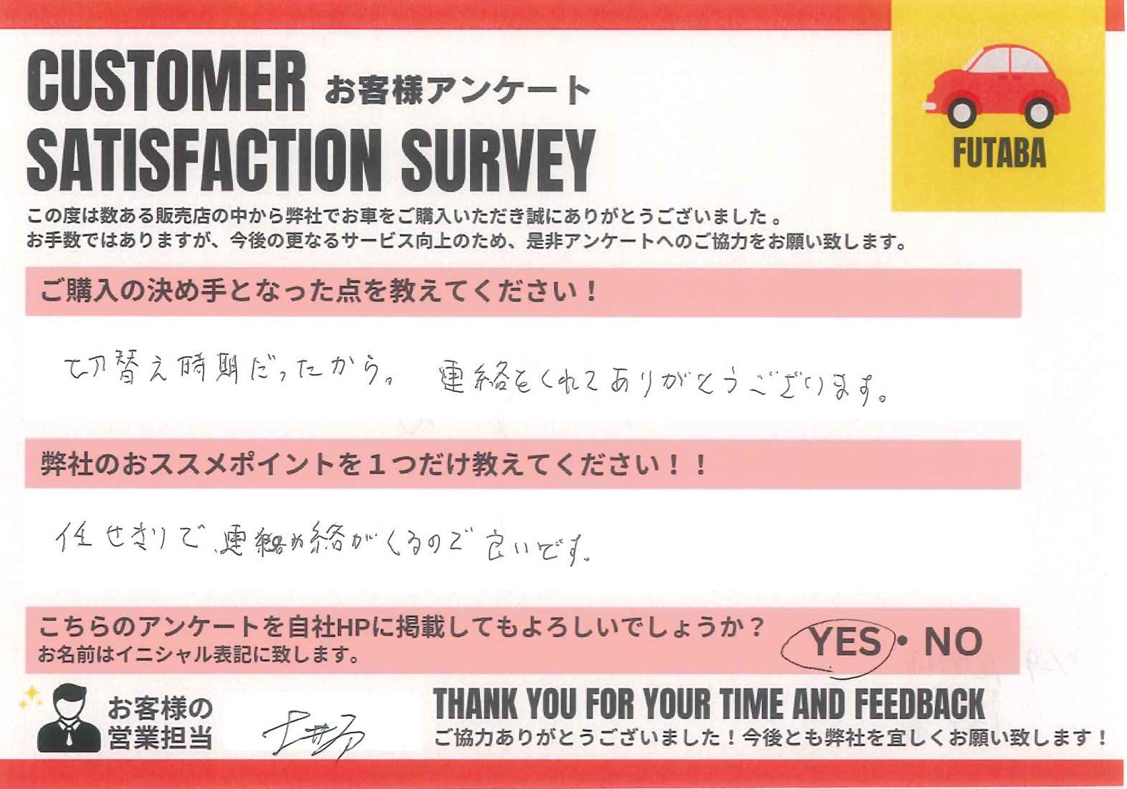 今後のカーライフも、担当の土井原をはじめ、双葉車輌スタッフ一同全力でサポートさせていただきます