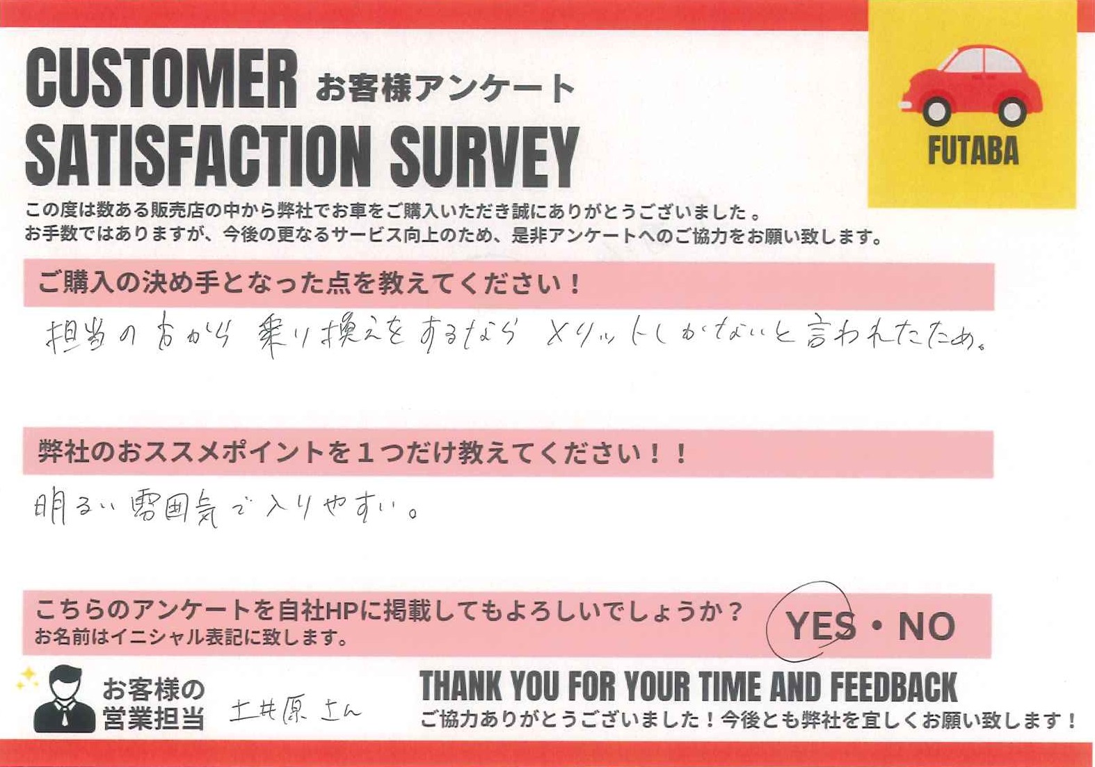 今後のカーライフも、担当の土井原をはじめ、双葉車輌スタッフ一同全力でサポートさせていただきます