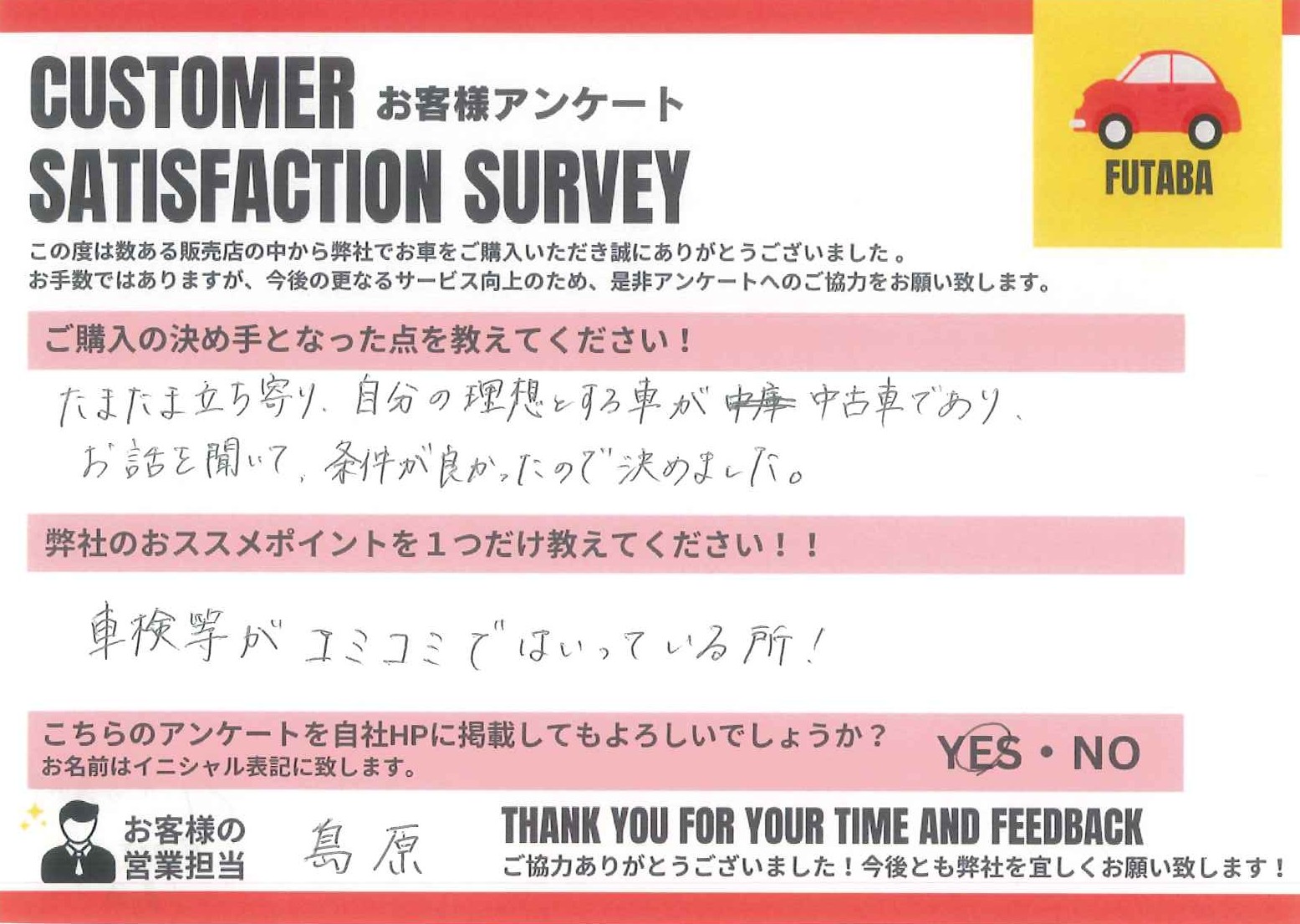今後のカーライフも、担当の島原をはじめ、双葉車輌スタッフ一同全力でサポートさせていただきます![]()
