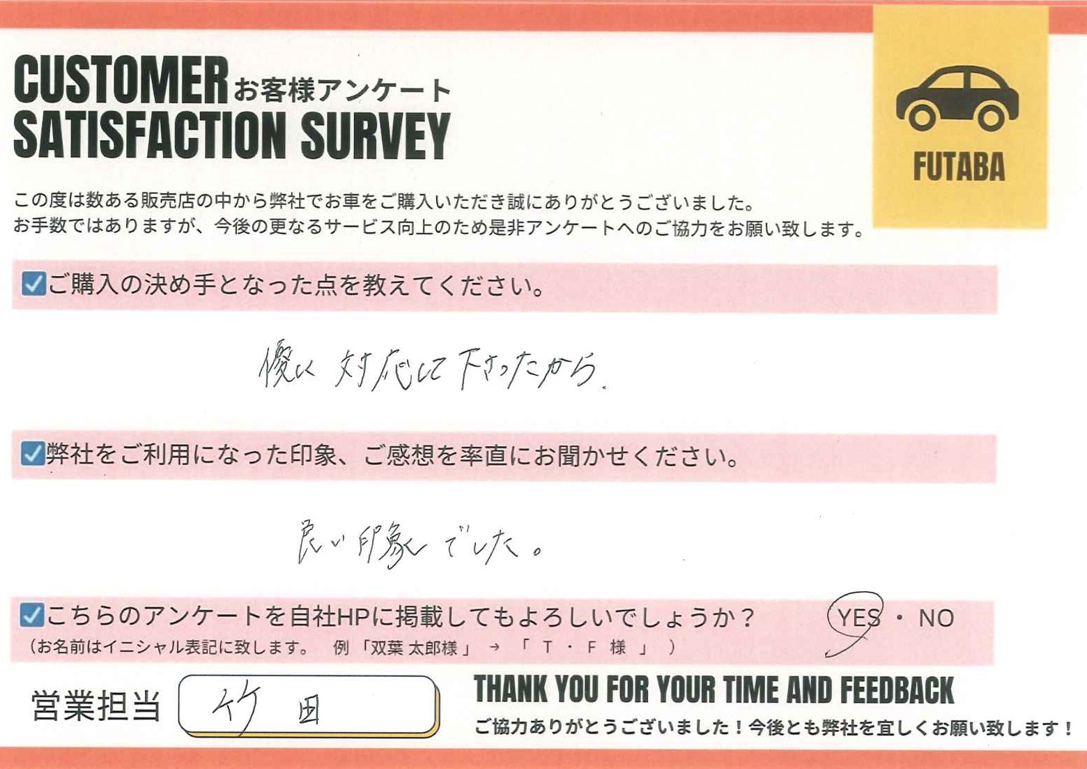 今後のカーライフも、担当の竹田をはじめ、双葉車輌スタッフ一同全力でサポートさせていただきます![]()