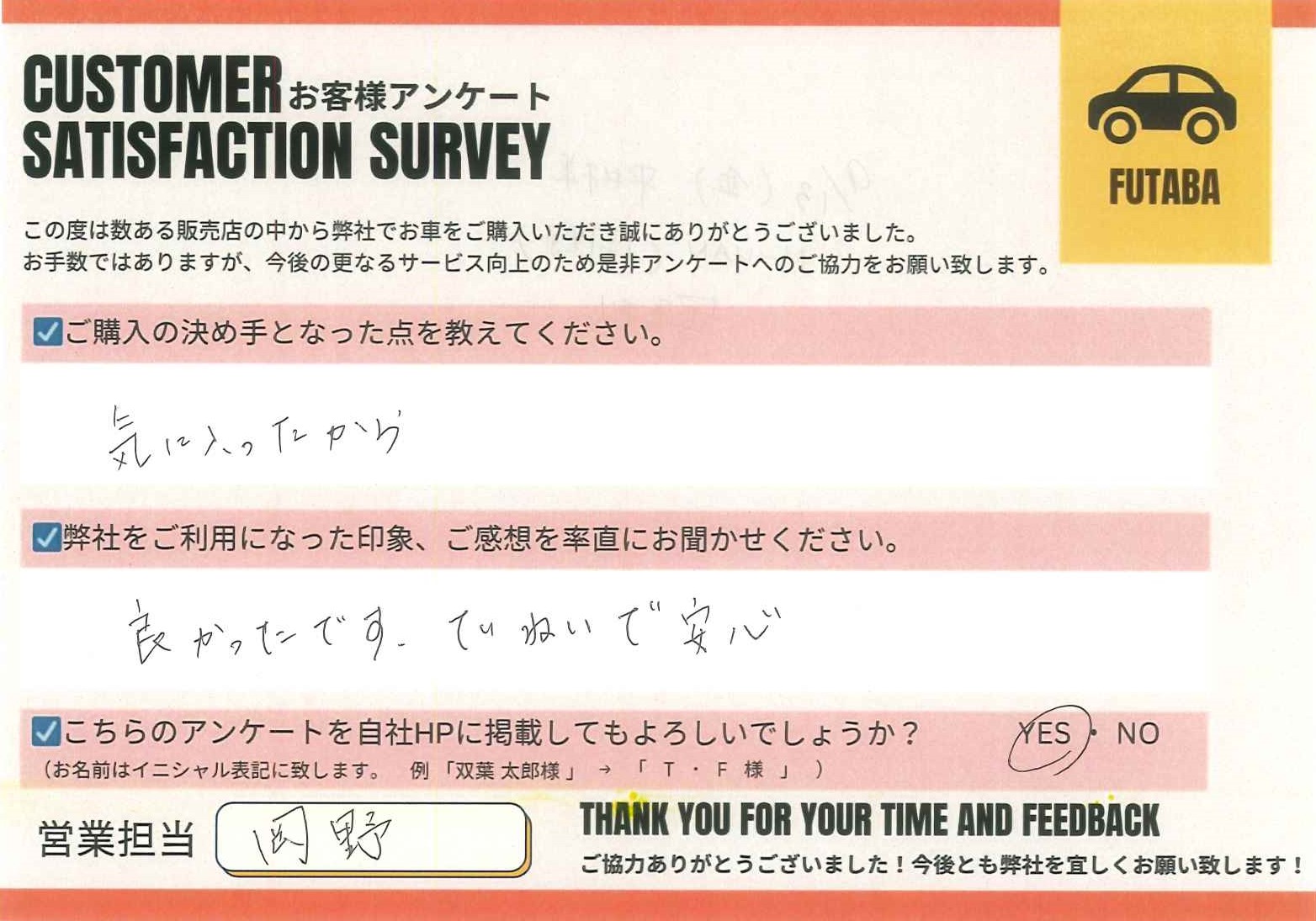 今後のカーライフも、担当の岡野をはじめ、双葉車輌スタッフ一同全力でサポートさせていただきます![]()