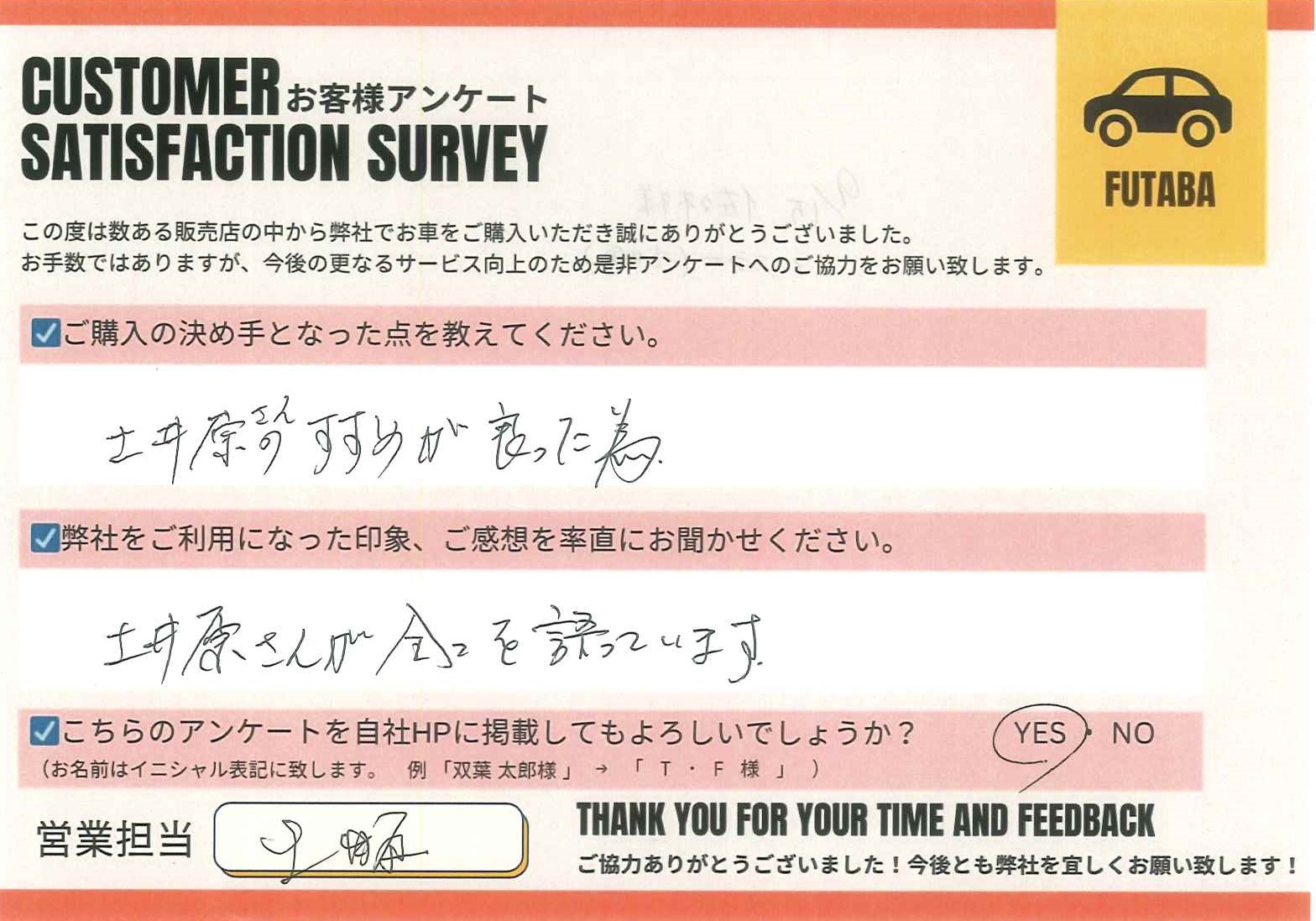 今後のカーライフも、担当の土井原をはじめ、双葉車輌スタッフ一同全力でサポートさせていただきます![]()