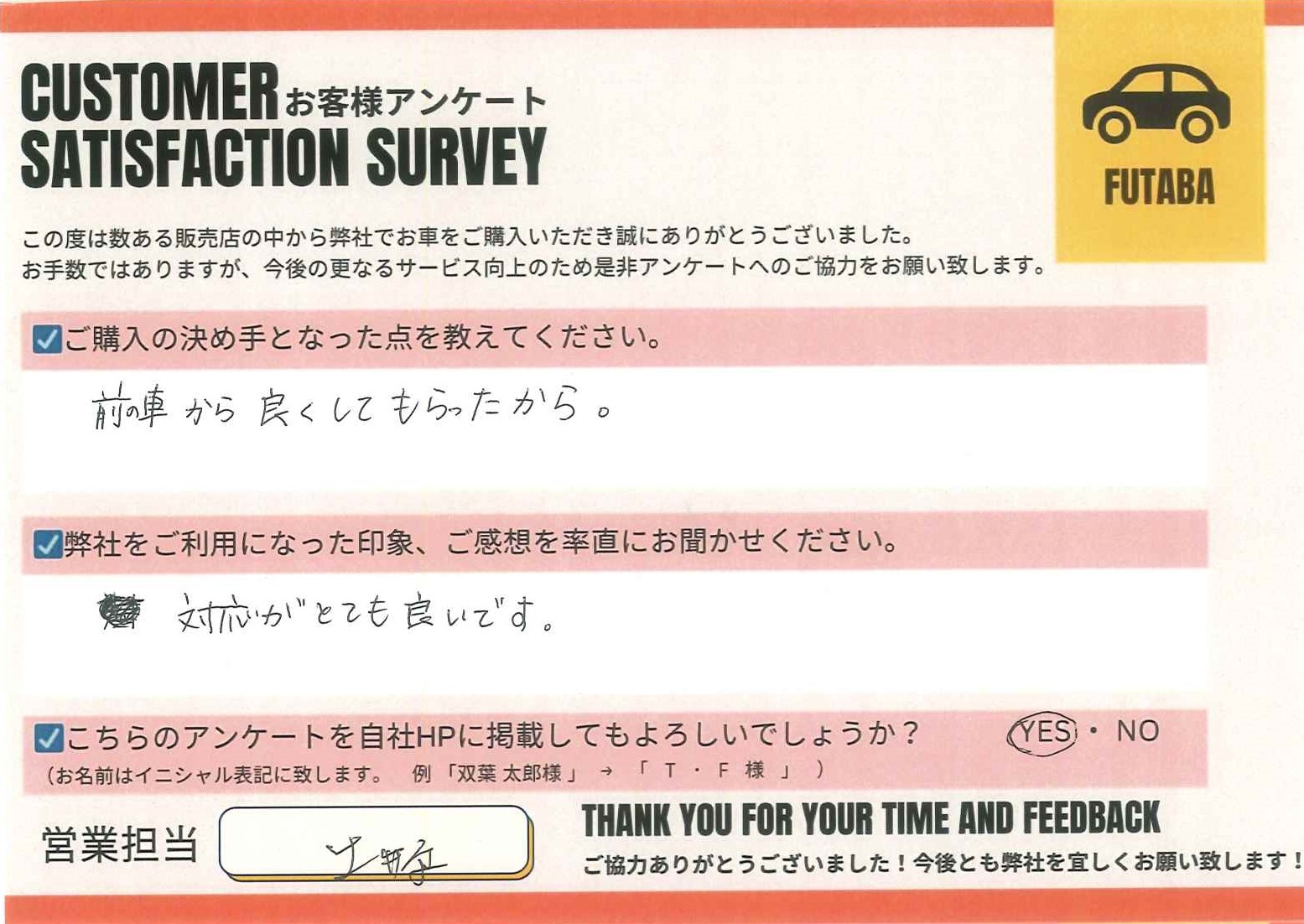 今後のカーライフも、担当の土井原をはじめ、双葉車輌スタッフ一同全力でサポートさせていただきます