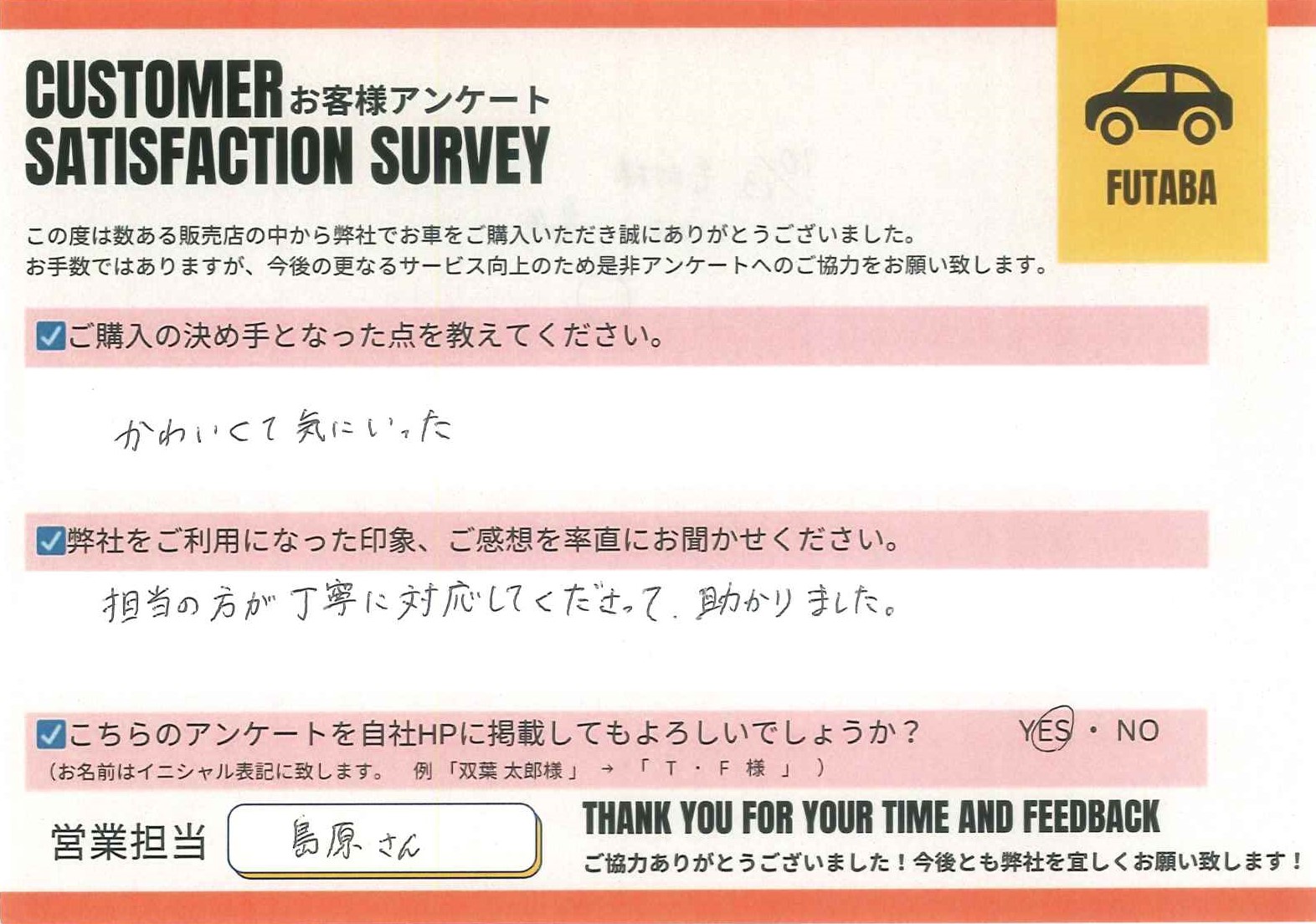 今後のカーライフも、担当の島原をはじめ、双葉車輌スタッフ一同全力でサポートさせていただきます![]()